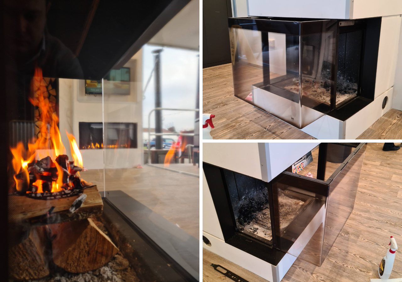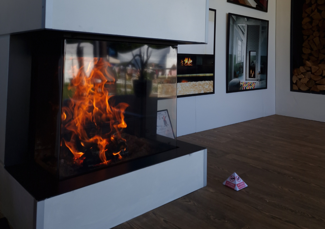 The wood burning Luna Diamond 800DC 3-sided fireplace by M-Design. This fireplace has a glass window with a pass through view: the best choice to highlight the flame by creating a room divider.