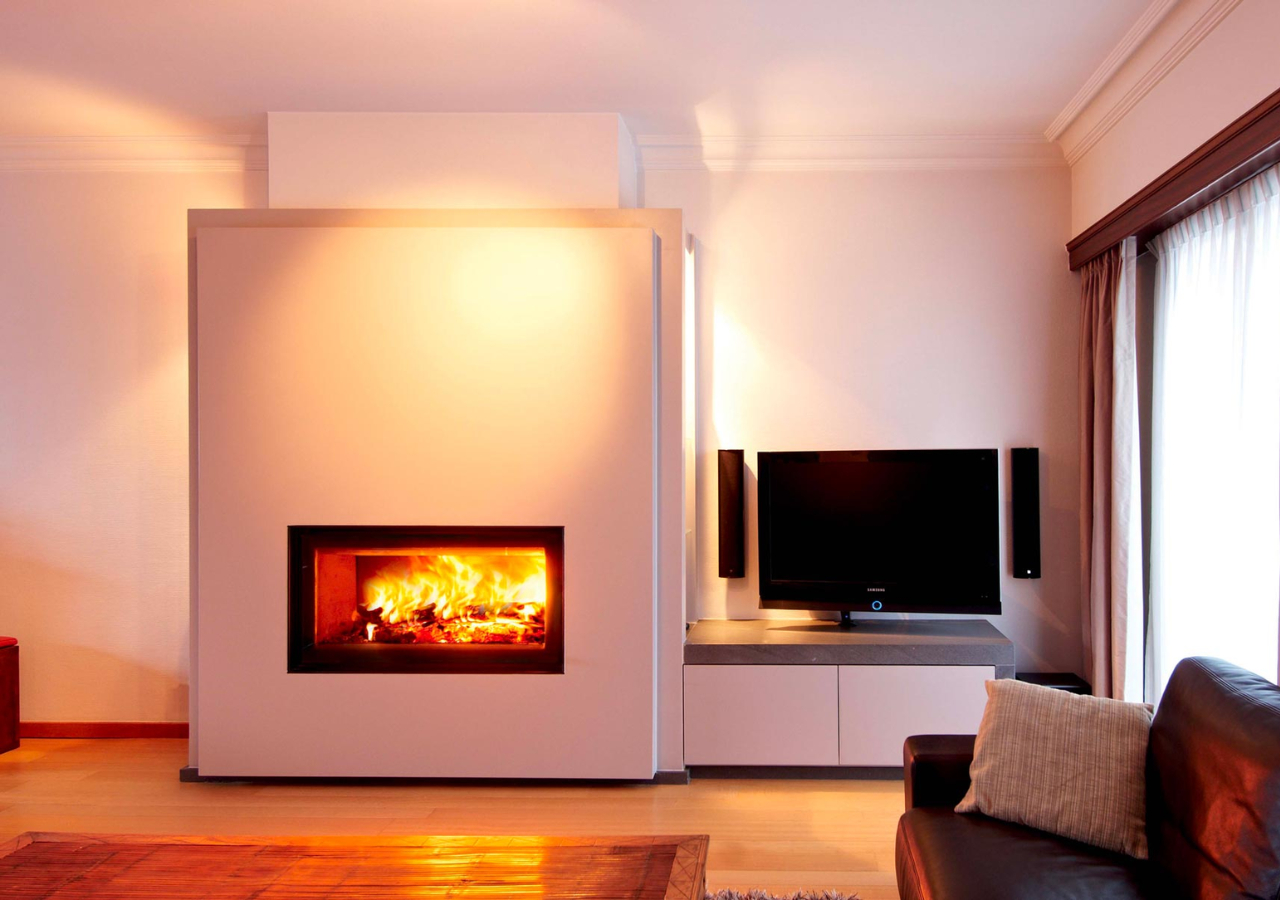 The fireplace features a revolving door with a glass or metal swing door, making maintenance easy and quick. Optionally, you can choose a fan to spread the heat even better.