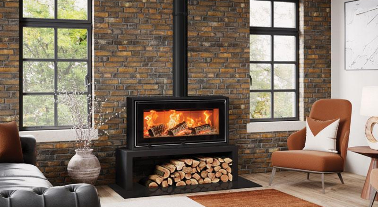 The Stovax Studio Air 2 Freestanding wood burning fire offers an impressive 8.2kW heat output, ensuring a stunning flame picture through its wide viewing window, and features a heat shield for reduced distance to combustibles. For enhanced visual allure and grandeur, Studio Air Freestanding models can be mounted on a Stovax stove bench. This Freestanding wood burning fire is also available as a smaller model.